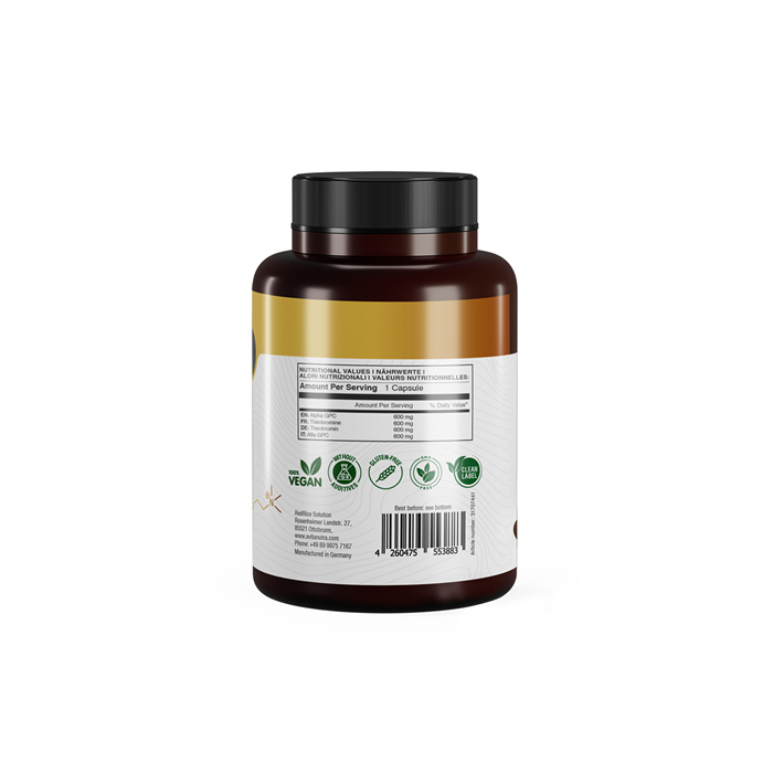 • IT: Supporta la funzione cognitiva, migliora la produzione di neurotrasmettitori, favorisce la memoria e la concentrazione, fonte di colina ad alta biodisponibilità, vegano & senza glutine.