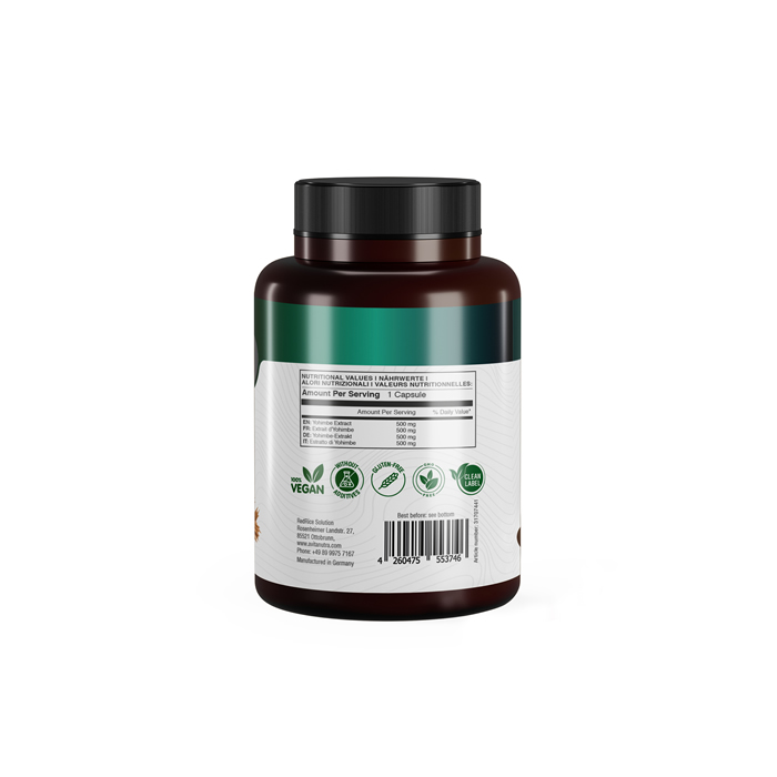 • EN: Supports natural energy levels, traditionally used for performance & vitality, enhances blood circulation, 100:1 Yohimbe extract for maximum potency, vegan & gluten-free.