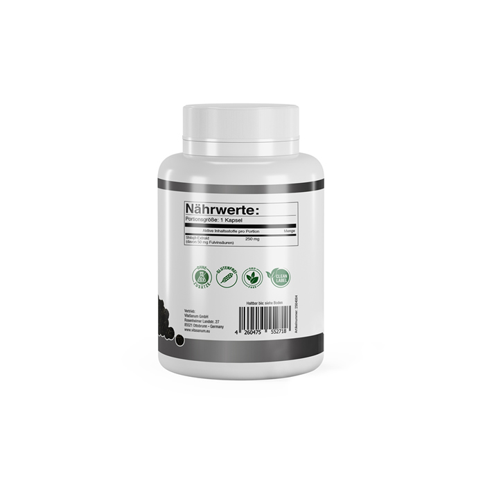Shilajit-Extrakt (standardisiert auf 20 % Fulvinsäure), Kapselhülle: Hydroxypropylmethylcellulose.