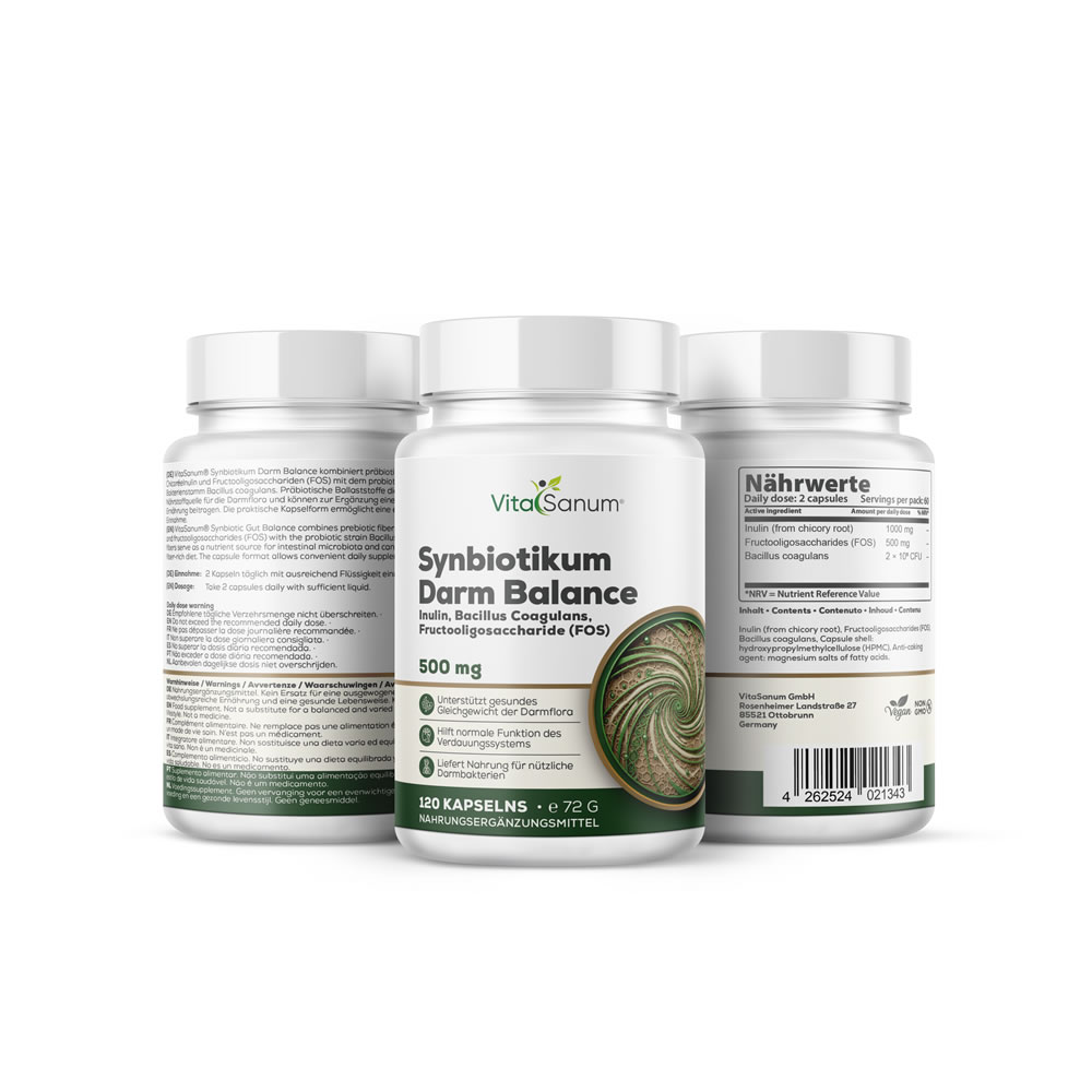 VitaSanum® Synbiotikum Darm Balance kombiniert präbiotische Ballaststoffe aus Chicorée-Inulin und Fructooligosacchariden (FOS) mit dem probiotischen Bakterienstamm Bacillus coagulans. Präbiotische Ballaststoffe dienen als Nährstoffquelle für die Darmflora und können zur Ergänzung einer ballaststoffreichen Ernährung beitragen. Die praktische Kapselform ermöglicht eine einfache tägliche Einnahme im Rahmen einer ausgewogenen Ernährung und bewussten Lebensweise.